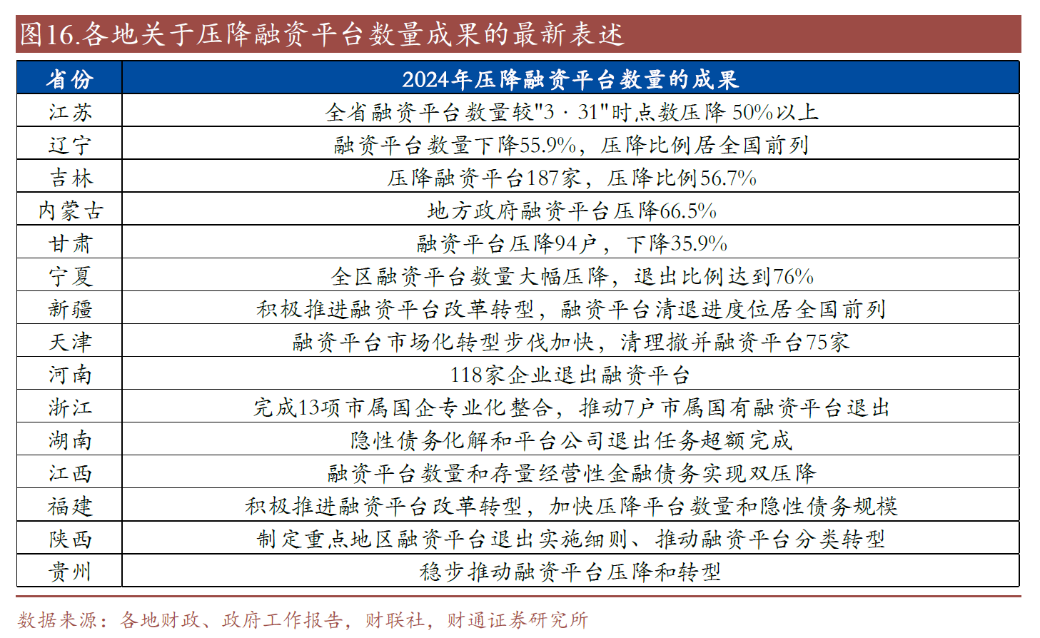 2025年,多地依然把壓降融資平臺數(shù)量、推動(dòng)融資平臺退出與轉(zhuǎn)型作為化債工作的重點(diǎn)。150號文明確提到退平臺時(shí)間不晚于2027年6月末,各省根據(jù)化債情況,地方政府可能會(huì)提前退平臺的時(shí)間要求,我們預(yù)計(jì)2025年將會(huì)是各地城投融資平臺“退名單”的大年。