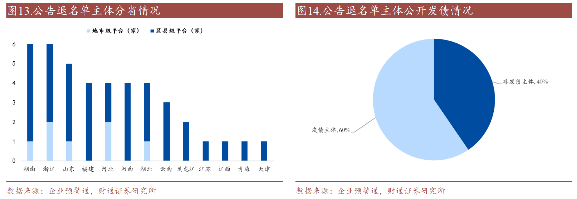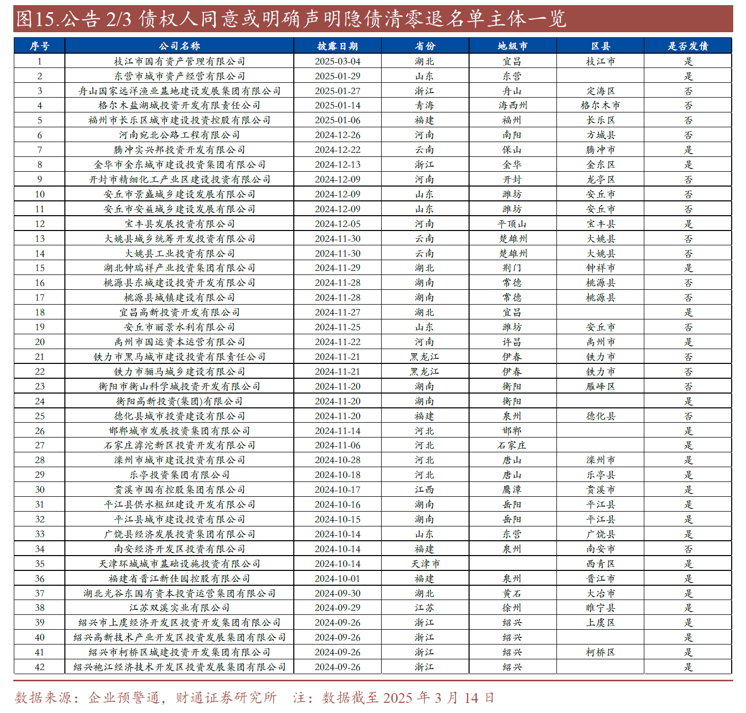 截至目前,公開就擬退出融資平臺名單征求2/3金融債權(quán)人同意或明確聲明隱債清零退出名單的主體共42家,以區(qū)縣級平臺為主,主要分布在湖南、浙江、山東等省份,其中發(fā)債主體占比60%,非發(fā)債主體占比40%。