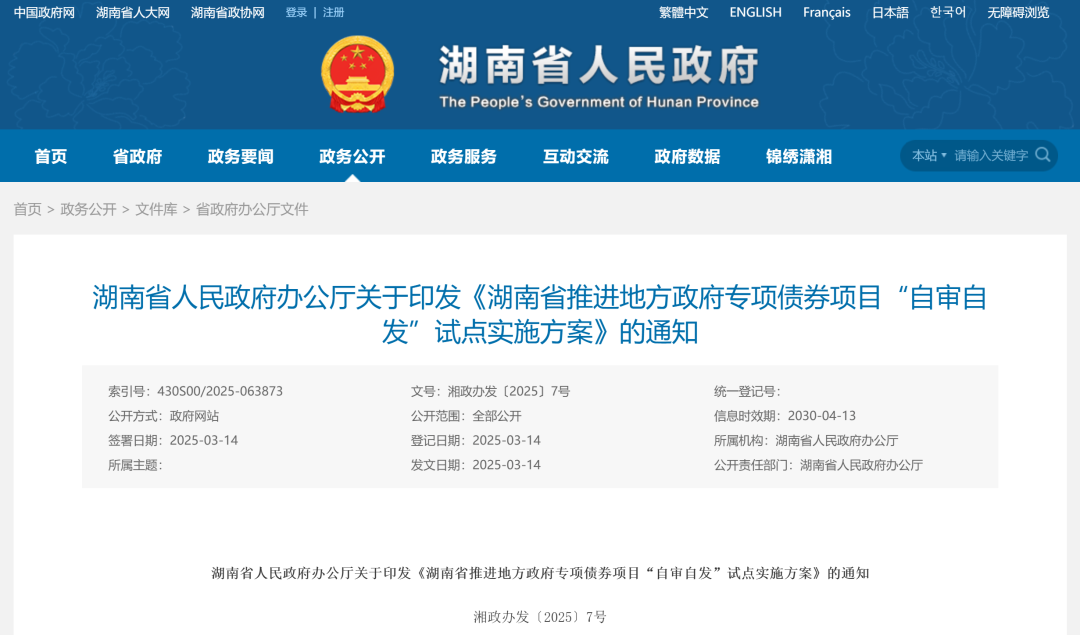 湖南省人民政府辦公廳關(guān)于印發(fā)《湖南省推進地方政府專項債券項目“自審自發(fā)”試點實施方案》的通知
