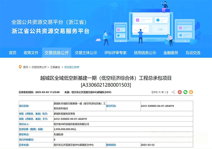 2025年3月,浙江省公共資源交易服務(wù)平臺上發(fā)布項(xiàng)目公告——紹興市越城區(qū)全域低空新基建一期工程總承包項(xiàng)目,總投資規(guī)模達(dá)20.5億元。該項(xiàng)目不僅創(chuàng)下全國低空經(jīng)濟(jì)領(lǐng)域公開招標(biāo)項(xiàng)目的最高紀(jì)錄,同時(shí)也是全國首個(gè)以“全域低空新基建”命名的總承包項(xiàng)目,是低空經(jīng)濟(jì)從“試點(diǎn)探索”邁向“全域落地”的關(guān)鍵一步。