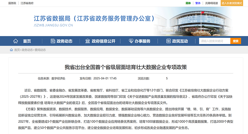 關于印發(fā)《江蘇省培育壯大數(shù)據(jù)企業(yè)行動方案(2025-2027年)》的通知