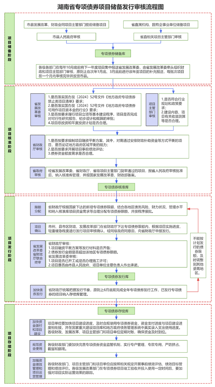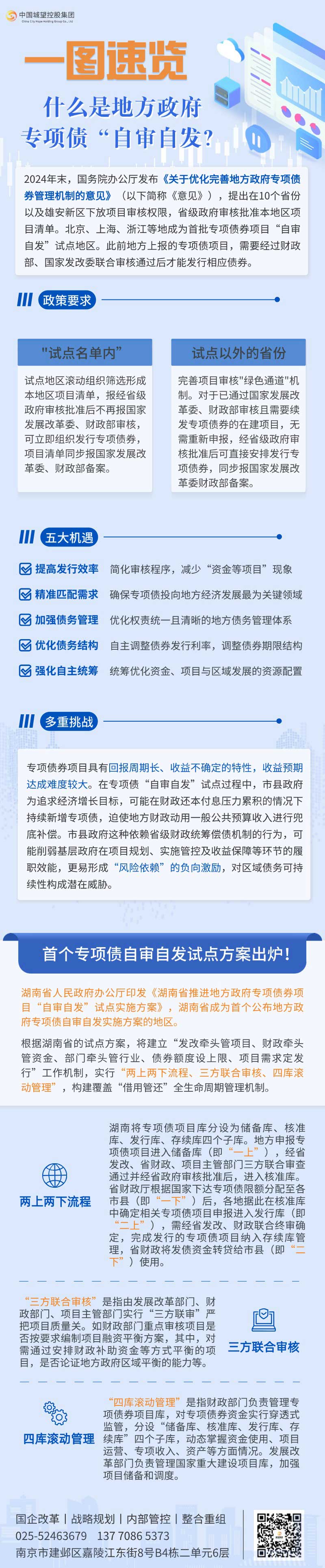 2024年12月,國務(wù)院辦公廳印發(fā)《關(guān)于優(yōu)化完善地方政府專項債券管理機制的意見》。其中提出,開展專項債券項目“自審自發(fā)”試點,在北京市、上海市、江蘇省、浙江?。ê瑢幉ㄊ校不帐?、福建?。ê瑥B門市)、山東?。ê鄭u市)、湖南省、廣東?。ê钲谑校?、四川省10個省份以及雄安新區(qū)下放項目審核權(quán)限,省級政府審核批準本地區(qū)項目清單。今年3月,湖南省成為首個公開發(fā)布地方政府專項債券自審自發(fā)實施方案的地區(qū)。