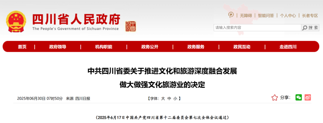 中共四川省委十二屆七次全體會議深入貫徹黨中央決策部署和習(xí)近平總書記重要指示精神,就推進(jìn)文化和旅游深度融合發(fā)展、做大做強(qiáng)文化旅游業(yè)進(jìn)行了研究,作出如下決定。一、堅定推進(jìn)文化和旅游深度融合發(fā)展推進(jìn)文化和旅游深度融合發(fā)展,是以習(xí)近平同志為核心的黨中央著眼建設(shè)文化強(qiáng)國旅游強(qiáng)國作出的重大戰(zhàn)略部署,對于增強(qiáng)文化自信、服務(wù)人民群眾美好生活、促進(jìn)高質(zhì)量發(fā)展具有重大意義。習(xí)近平總書記深刻指出,文化產(chǎn)業(yè)和旅游產(chǎn)業(yè)密不可分,要堅持以文塑旅、以旅彰文,把文旅產(chǎn)業(yè)真正打造成為支柱產(chǎn)業(yè)、民生產(chǎn)業(yè)、幸福產(chǎn)業(yè)。習(xí)近平總書記對四川文化和旅游發(fā)展寄予厚望、多次作出重要指示,賦予共建巴蜀文化旅游走廊的重大任務(wù),要求充分綻放獨特的自然生態(tài)之美、多彩人文之韻,譜寫美麗中國的四川篇章。全省上下要堅定貫徹習(xí)近平總書記重要指示精神,把文化和旅游深度融合發(fā)展擺在治蜀興川更加突出的位置,加快把文旅資源優(yōu)勢轉(zhuǎn)化為高質(zhì)量發(fā)展優(yōu)勢,為譜寫中國式現(xiàn)代化四川新篇章提供有力支撐。四川推進(jìn)文化和旅游深度融合發(fā)展,要以習(xí)近平新時代中國特色社會主義思想為指導(dǎo),全面貫徹黨的二十大和二十屆二中、三中全會精神,以建設(shè)習(xí)近平文化思想實踐新高地為引領(lǐng),牢牢把握社會主義先進(jìn)文化前進(jìn)方向,堅持把社會效益放在首位、社會效益和經(jīng)濟(jì)效益相統(tǒng)一,堅持文化為魂、旅游為體、科技賦能、保護(hù)優(yōu)先,著力做大做強(qiáng)文化旅游業(yè),深化“文旅+百業(yè)”“百業(yè)+文旅”,突出高能級主體培育和高品質(zhì)產(chǎn)品供給,推進(jìn)品牌、業(yè)態(tài)、服務(wù)和體制機(jī)制融合,努力走出一條具有中國特色、彰顯巴蜀魅力的文化和旅游深度融合發(fā)展新路子。四川推進(jìn)文化和旅游深度融合發(fā)展的總目標(biāo)是:到2027年,全省文化和旅游發(fā)展格局進(jìn)一步優(yōu)化,引育一批競爭力和帶動力強(qiáng)的文旅鏈主企業(yè),形成一批具有四川特色和優(yōu)勢的文旅融合業(yè)態(tài),文化及相關(guān)產(chǎn)業(yè)增加值、旅游總花費分別達(dá)到3800億元、2萬億元左右,文旅產(chǎn)業(yè)成為戰(zhàn)略性支柱產(chǎn)業(yè)。到2030年,文化和旅游深度融合發(fā)展體制機(jī)制更加健全,巴蜀文化影響力、四川旅游吸引力、文旅產(chǎn)業(yè)競爭力顯著提升,文化強(qiáng)省旅游強(qiáng)省建設(shè)邁上新臺階。(一)建設(shè)世界級文旅地標(biāo)。擴(kuò)大標(biāo)志性品牌國際影響力,提升三星堆—金沙、九寨溝—黃龍、大熊貓、峨眉山—樂山大佛、青城山—都江堰、翠云廊—劍門關(guān)品牌知名度,培育若爾蓋濕地、稻城亞丁等世界級文旅新地標(biāo),打造享譽(yù)全球、來川必游的文旅旗艦項目。打造世界級文旅風(fēng)景道,高標(biāo)準(zhǔn)建設(shè)國道318/317中國最美景觀大道,打造藏羌彝民族風(fēng)情、蜀道三國文化、大巴山—嘉陵江紅色文化、岷江生態(tài)文化、天府大道城市文化等主題文旅風(fēng)景道,推出具有全球吸引力的精品線路。(二)做靚特色文旅名片。實施天府文藝名作高峰計劃,持續(xù)打造“文藝川軍”品牌,建設(shè)一批文藝創(chuàng)作基地、網(wǎng)絡(luò)視聽和影視產(chǎn)業(yè)園區(qū),鼓勵開展網(wǎng)絡(luò)文學(xué)、科幻文學(xué)、數(shù)字文娛、游戲動漫等領(lǐng)域創(chuàng)作,扶持和推出一批文學(xué)、影視、舞臺藝術(shù)、視覺藝術(shù)優(yōu)質(zhì)作品。深化文旅名城建設(shè),支持成都增強(qiáng)極核帶動作用、加快建設(shè)世界文化名城和世界旅游名城,支持自貢、攀枝花、德陽、廣元、樂山、南充、宜賓建設(shè)國際旅游城市,加快建設(shè)區(qū)域旅游中心城市和特色旅游城市,提升建設(shè)天府旅游名縣。做強(qiáng)巴蜀名人文旅品牌,建好用好四川名人館,加強(qiáng)偉人將帥故里、革命烈士和歷史名人紀(jì)念設(shè)施保護(hù)利用,推進(jìn)三蘇故里文化旅游片區(qū)建設(shè),協(xié)同打造“東坡行旅”中國文物主題游徑。打造“川字號”文旅名品,圍繞標(biāo)志性文化知識產(chǎn)權(quán)(IP)推進(jìn)文創(chuàng)產(chǎn)品設(shè)計、制造、服務(wù)全鏈發(fā)展,加強(qiáng)文旅領(lǐng)域知識產(chǎn)權(quán)保護(hù)。擦亮川菜金字招牌,發(fā)布四川美食旅游地圖,辦好世界川菜大會,支持成都、樂山等建設(shè)世界美食之都。深度開發(fā)國家地理標(biāo)志產(chǎn)品,做優(yōu)川酒、川茶、川果、川竹、川藥等特色產(chǎn)品,培育“煙火里·慢生活”休閑文旅品牌。(三)實施巴蜀文旅全球推廣計劃。建強(qiáng)四川文旅宣傳推廣平臺,提升金熊貓獎國際影響力,辦好中國網(wǎng)絡(luò)視聽大會、四川國際旅游交易博覽會等活動,發(fā)揮好中國(成都)國際科幻大會綜合效應(yīng),增強(qiáng)文化交流、旅游推介等功能。強(qiáng)化新媒體傳播,提升打造“熊貓走世界”“川燈耀世界”等國際傳播熱點,培育推出一批網(wǎng)紅打卡地,發(fā)揮網(wǎng)絡(luò)名人、