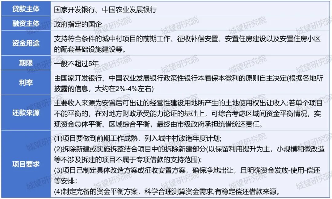 根據(jù)住建部、財政部、中國人民銀行、金融監(jiān)管總局印發(fā)的《關于通過專項借款支持城中村改造工作方案》,城中村改造專項借款(表2)以城市為單位,由市人民政府承擔統(tǒng)借統(tǒng)還責任,確定合格的地方國企(原則為市屬全資國企)作為借款主體,向國家開發(fā)銀行、中國農業(yè)發(fā)展銀行兩家政策銀行申請的資金。