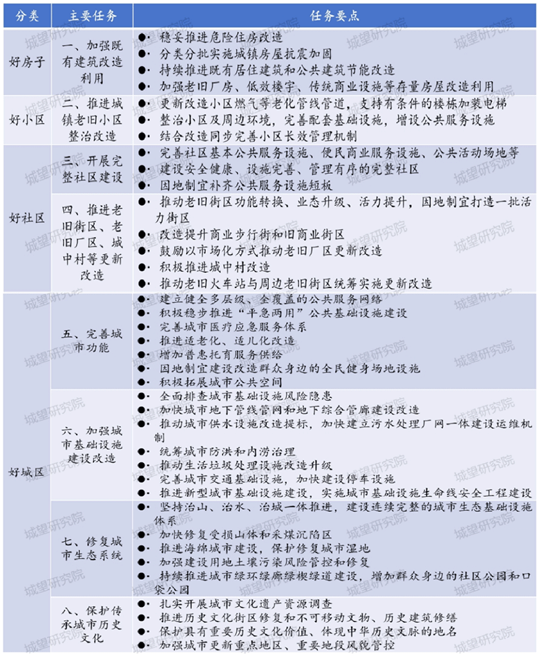 根據(jù)《意見》,城市更新任務細分為八大領域(表1),突破了傳統(tǒng)的碎片化思維,推進“好房子、好小區(qū)、好社區(qū)、好城區(qū)”四好建設,形成從單體建筑到城市生態(tài)的立體化治理格局。