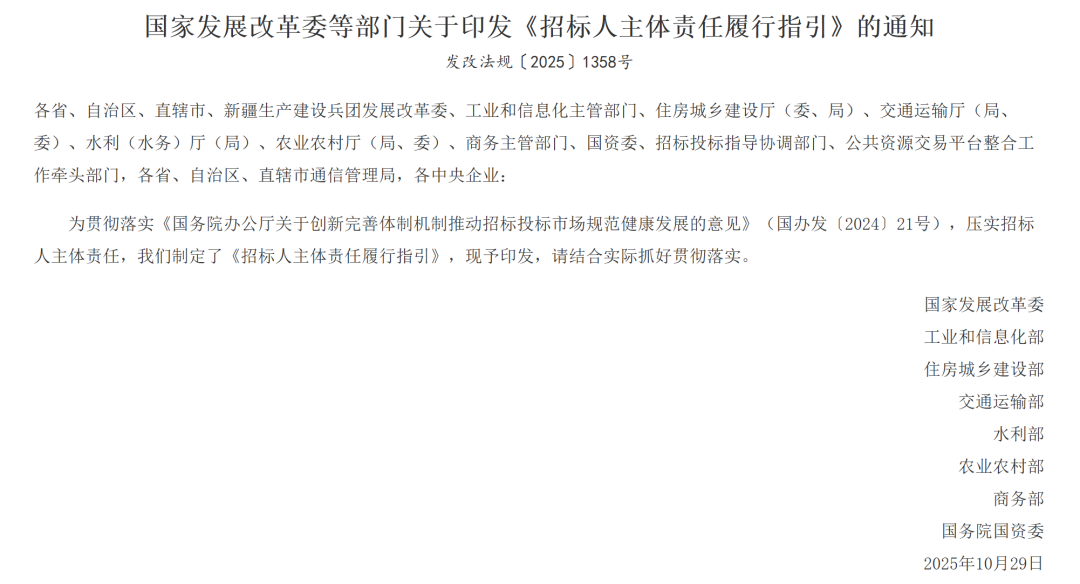 落實(shí)《政府工作報(bào)告》關(guān)于改革完善招標(biāo)投標(biāo)體制機(jī)制的部署要求,為引導(dǎo)和督促招標(biāo)人落實(shí)主體責(zé)任,提高招標(biāo)投標(biāo)活動(dòng)規(guī)范化科學(xué)化水平,近日,國(guó)家發(fā)展改革委、工業(yè)和信息化部、住房城鄉(xiāng)建設(shè)部、交通運(yùn)輸部、水利部、農(nóng)業(yè)農(nóng)村部、商務(wù)部、國(guó)務(wù)院國(guó)資委等8部門(mén)聯(lián)合印發(fā)了《國(guó)家發(fā)展改革委等部門(mén)關(guān)于印發(fā)〈招標(biāo)人主體責(zé)任履行指引〉的通知》(發(fā)改法規(guī)〔2025〕1358號(hào),以下簡(jiǎn)稱《指引》)。
