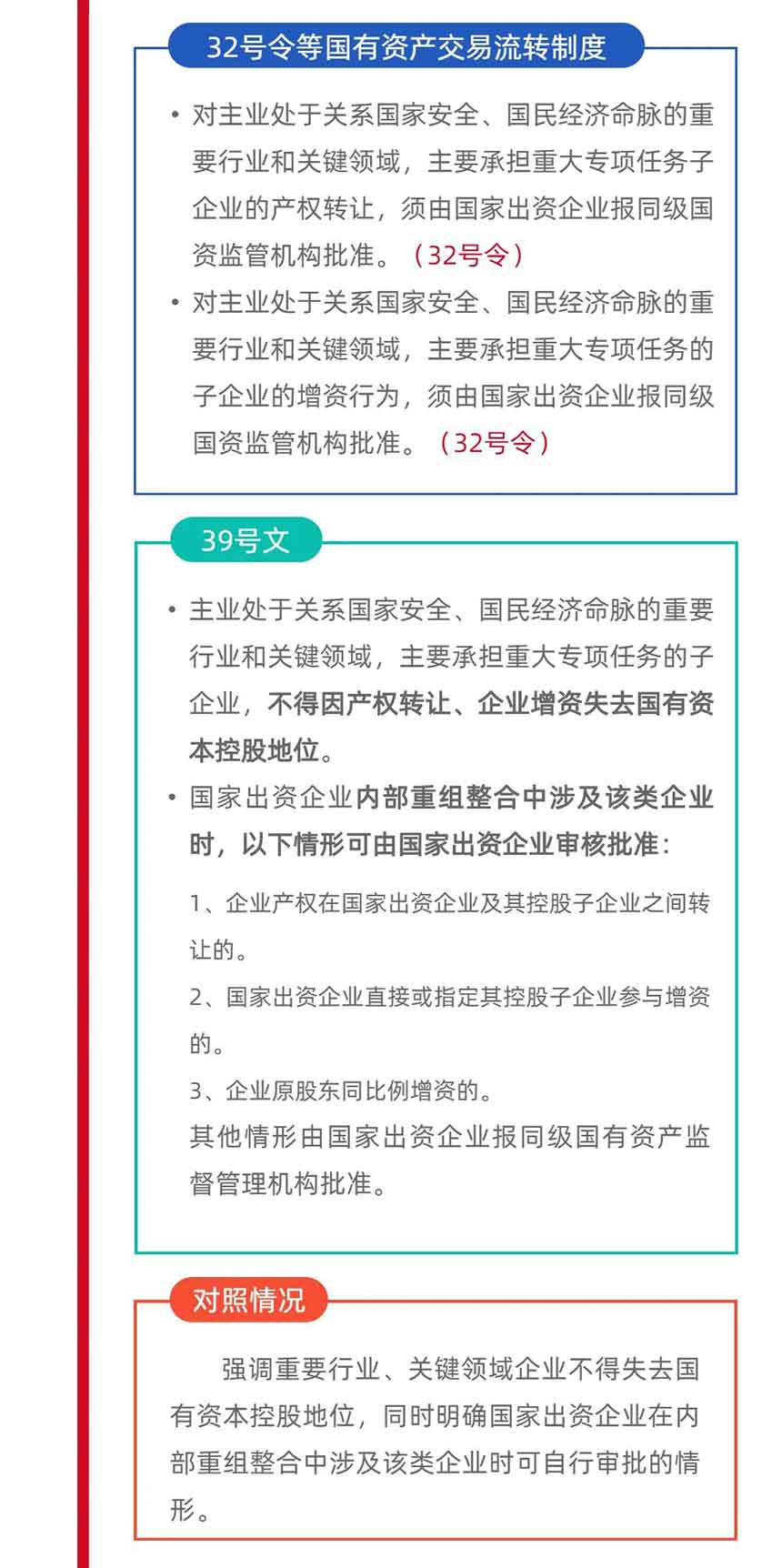 二是強調(diào)重要行業(yè)、關(guān)鍵領(lǐng)域企業(yè)不得失去國有資本控股地位,同時明確國家出資企業(yè)在內(nèi)部重組整合中涉及該類企業(yè)時可自行審批的情形;