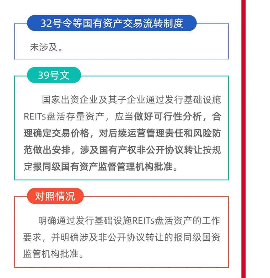 三是明確通過發(fā)行基礎(chǔ)設(shè)施REITs盤活存量資產(chǎn)的工作要求,并明確涉及非公開協(xié)議轉(zhuǎn)讓的報同級國資監(jiān)管機構(gòu)批準;