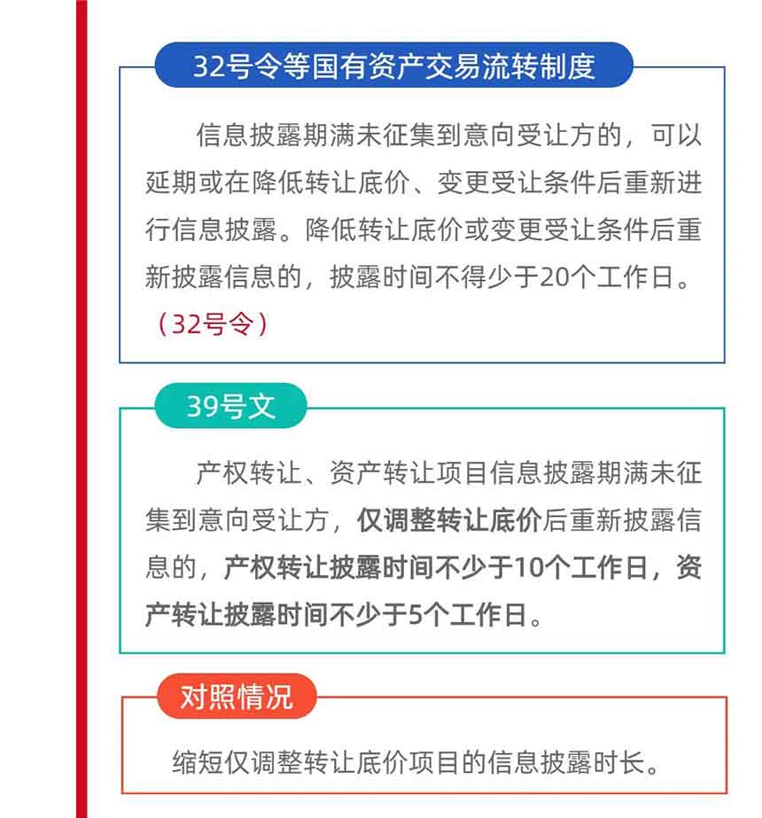 三是對于僅調(diào)整轉(zhuǎn)讓底價的項目,縮短重新信息披露時長;四是強調(diào)交易流轉(zhuǎn)環(huán)節(jié)對無形資產(chǎn)的管理要求,并明確相關(guān)要求應(yīng)在信息披露和交易合同中予以體現(xiàn)。