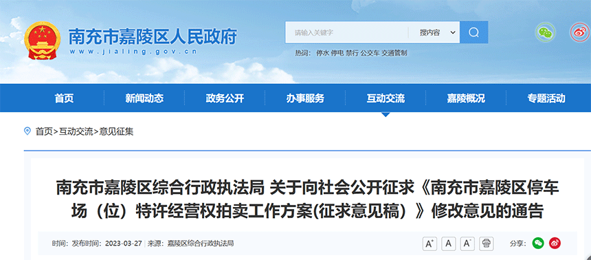 2023年4月,南充市嘉陵區(qū)綜合行政執(zhí)法局?jǐn)M對(duì)南充市嘉陵區(qū)濱河路、茶盤路等地停車場(chǎng)(位)特許經(jīng)營權(quán)進(jìn)行拍賣。由南充市嘉陵城市建設(shè)投資有限公司(南充本地國企)成功競(jìng)得,起拍價(jià)47642.29萬元,成交價(jià)4.9億元。